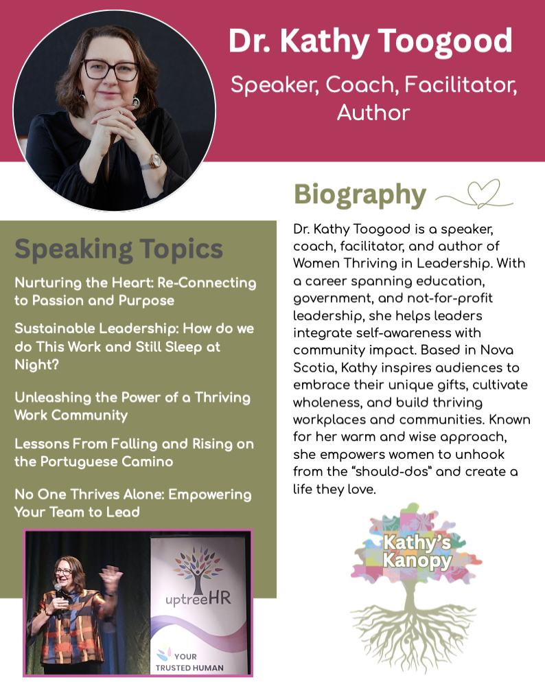 Welcome to Kanopy Consulting, and the online home of Dr. Kathy Toogood. I invite you to learn more about how I facilitate personal growth and system change by: